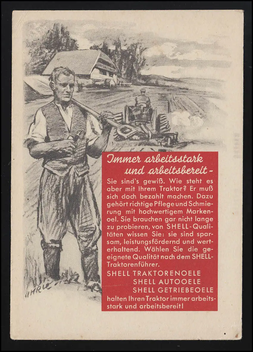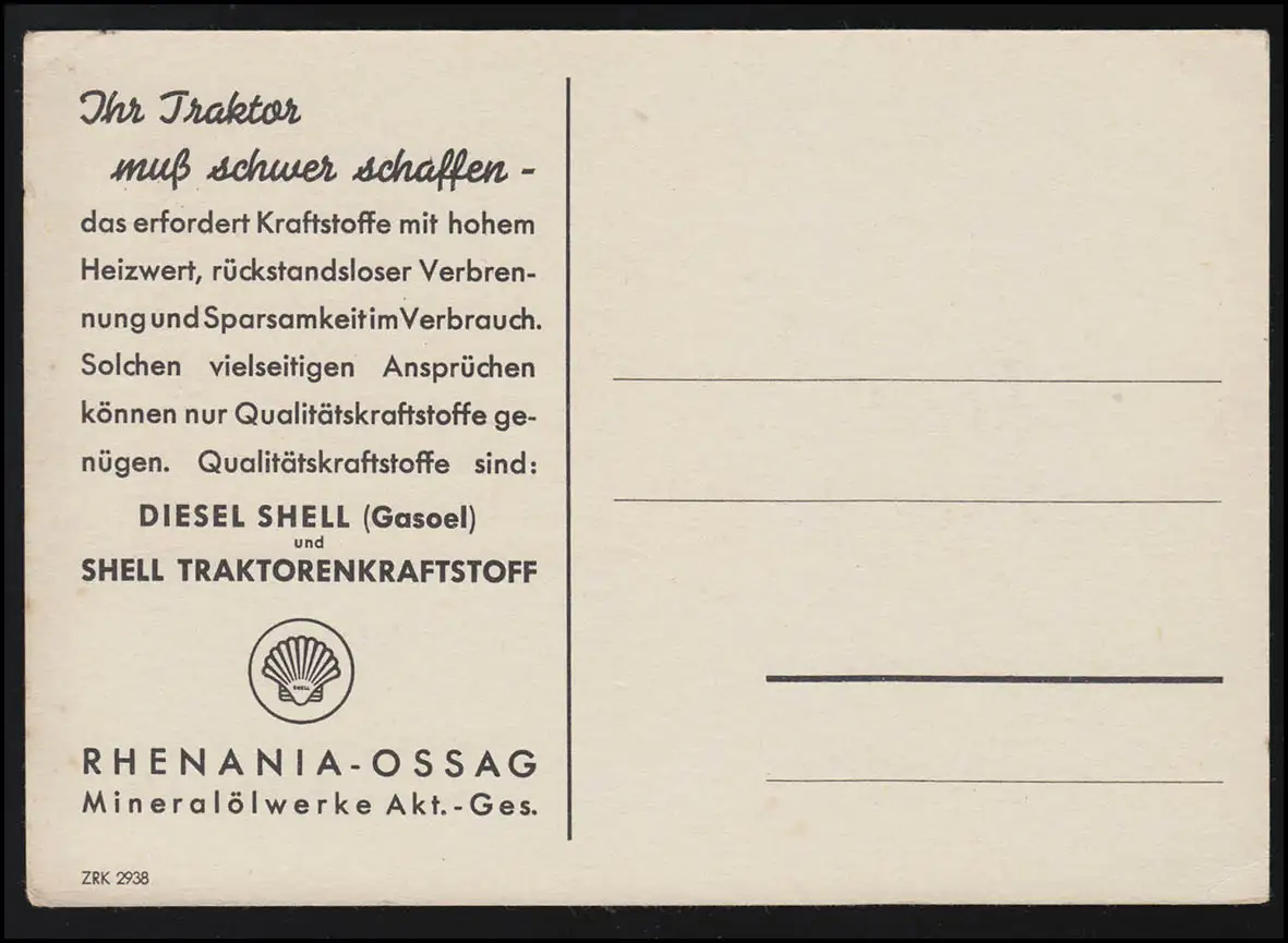 Publicité AK SHELL Huiles, travaux de tracteur paysan RHENANIA - OSSAG, non utilisé