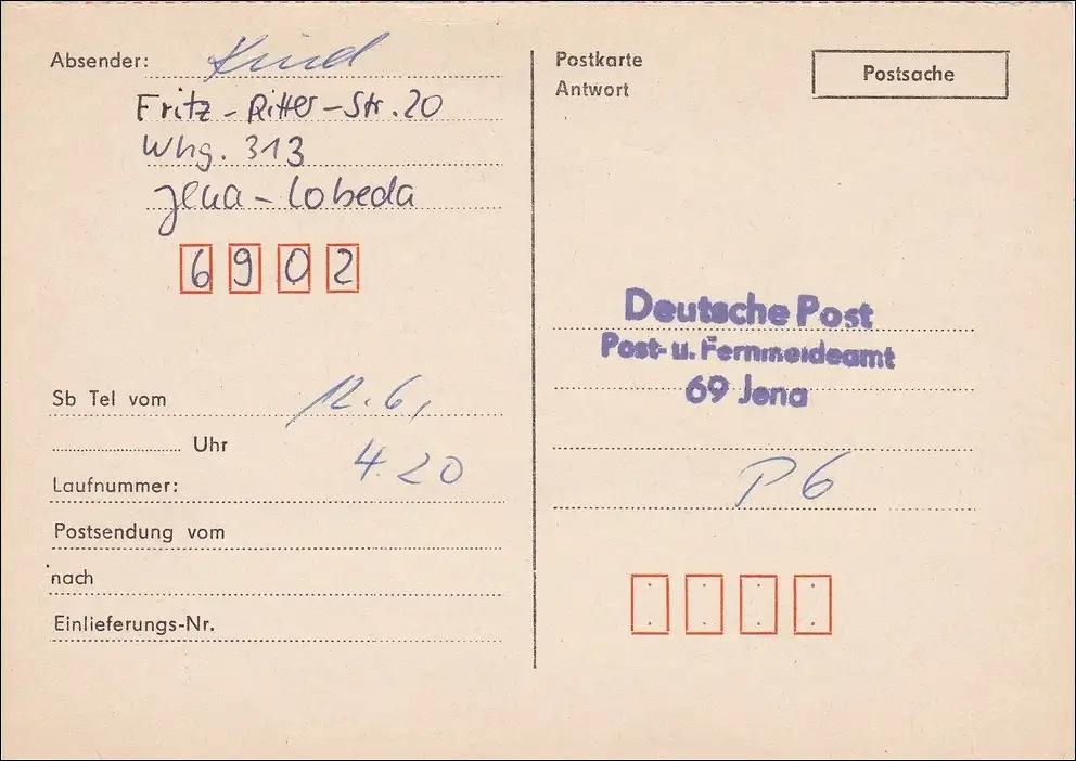 RDA: Carte postale de réponse comme affaire postale Jena