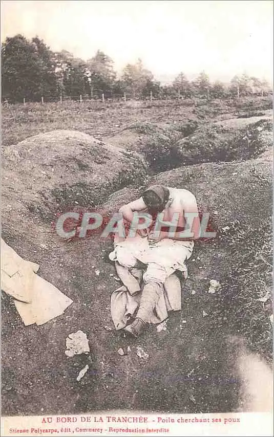 REPRO Au Bord de la Tranchee Poilu Cherchant ses poux Militaria