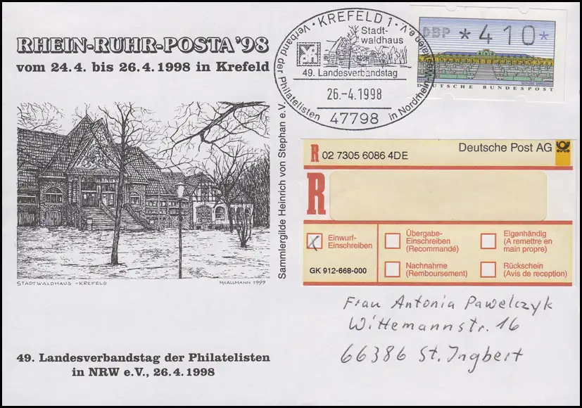 RHEIN-RUHR-Posta'98 & LV-Semaine, EF R-Bf SSt Krefeld Stadtwaldhaus 24.4.1998