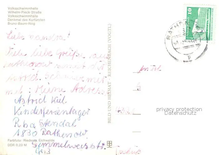 Rathenow Volksschwimmhalle Wilhelm Pieck Strasse Denkmal des Kurfuersten Bruno Baum Ring Wappen Rathenow postalisch gelaufen 1982 Erhaltung siehe scans [FriedD77] Frierer
