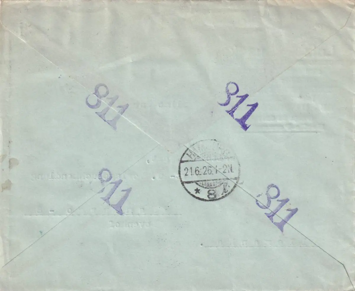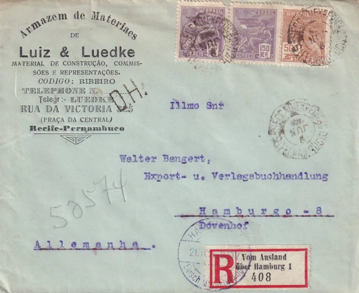 Recife, recommandé par l'étranger, courrier ferroviaire..., D.H. Stamp 1926 à Hambourg