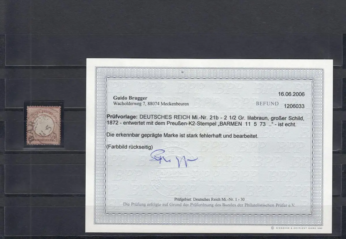 Reich allemand: MiNr. 21b, Stamp Barmen, BPP résultat