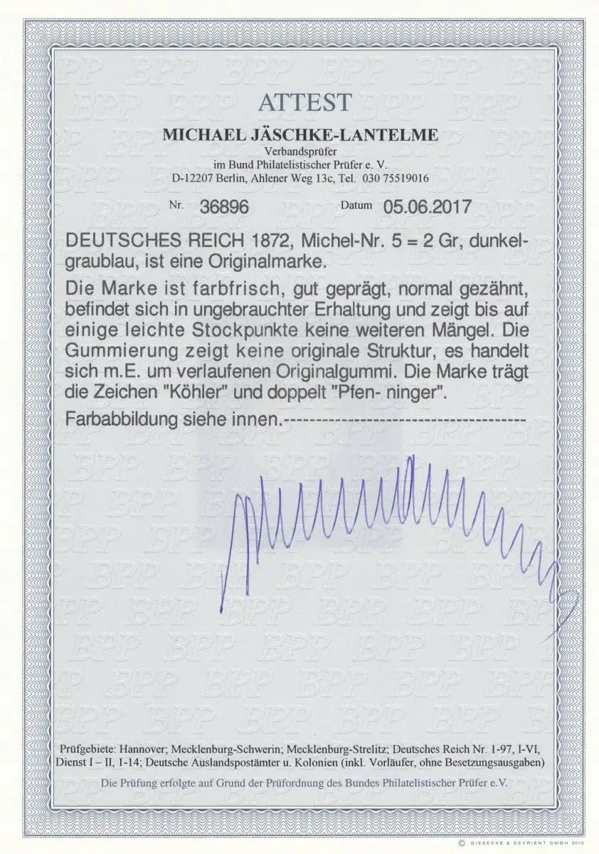 Reich allemand: MiNr. 5, inutilisé, Signature Pfenninger/Köhler, BPP Attest