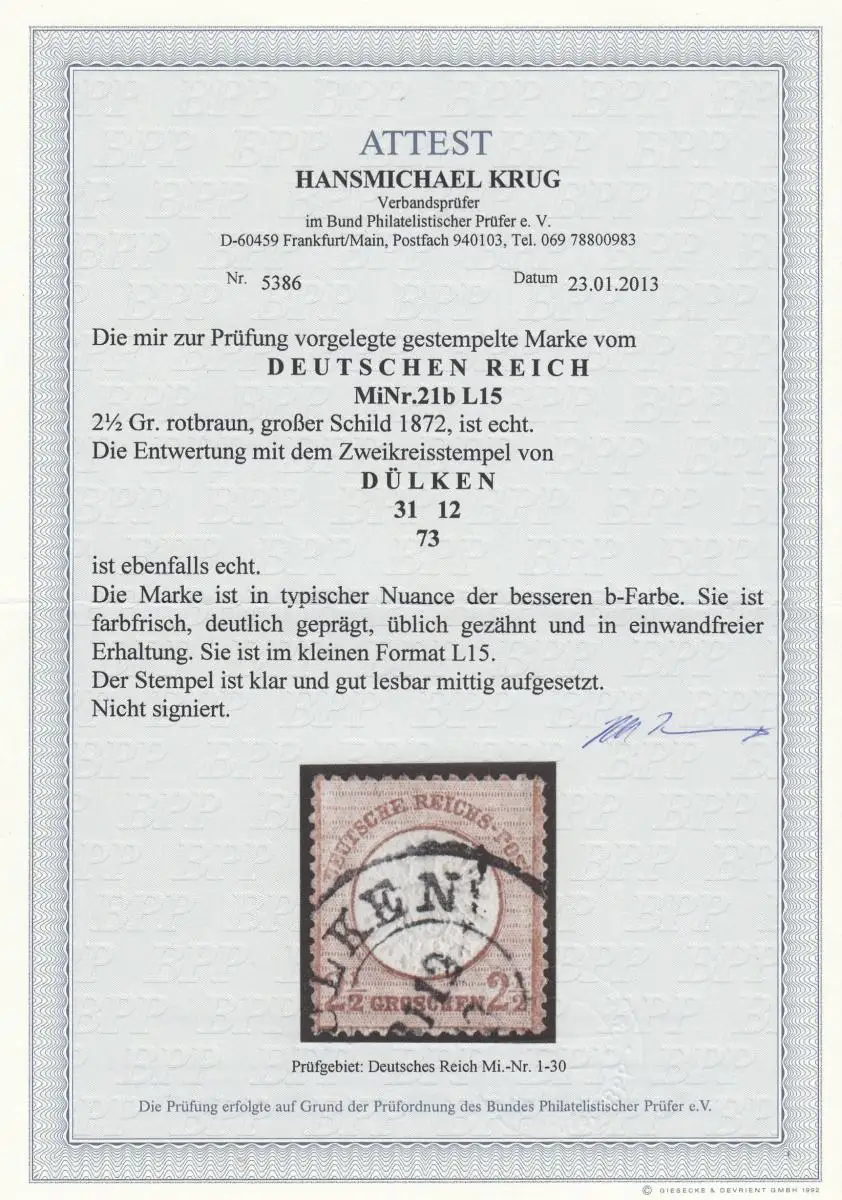 Reich allemand: Min. 21b L15, cacheté Dülken, BPP Attest