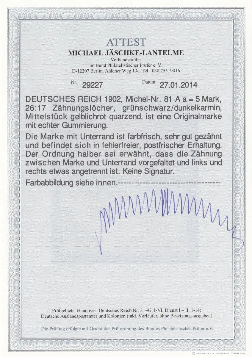 Reich allemand: Min° 81 A a **, BPP Attest