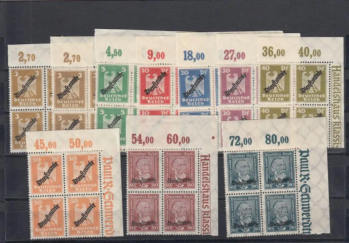 Reichsdienst: MiNr. 105-113, post-freisch, Quaderblock Eckrand