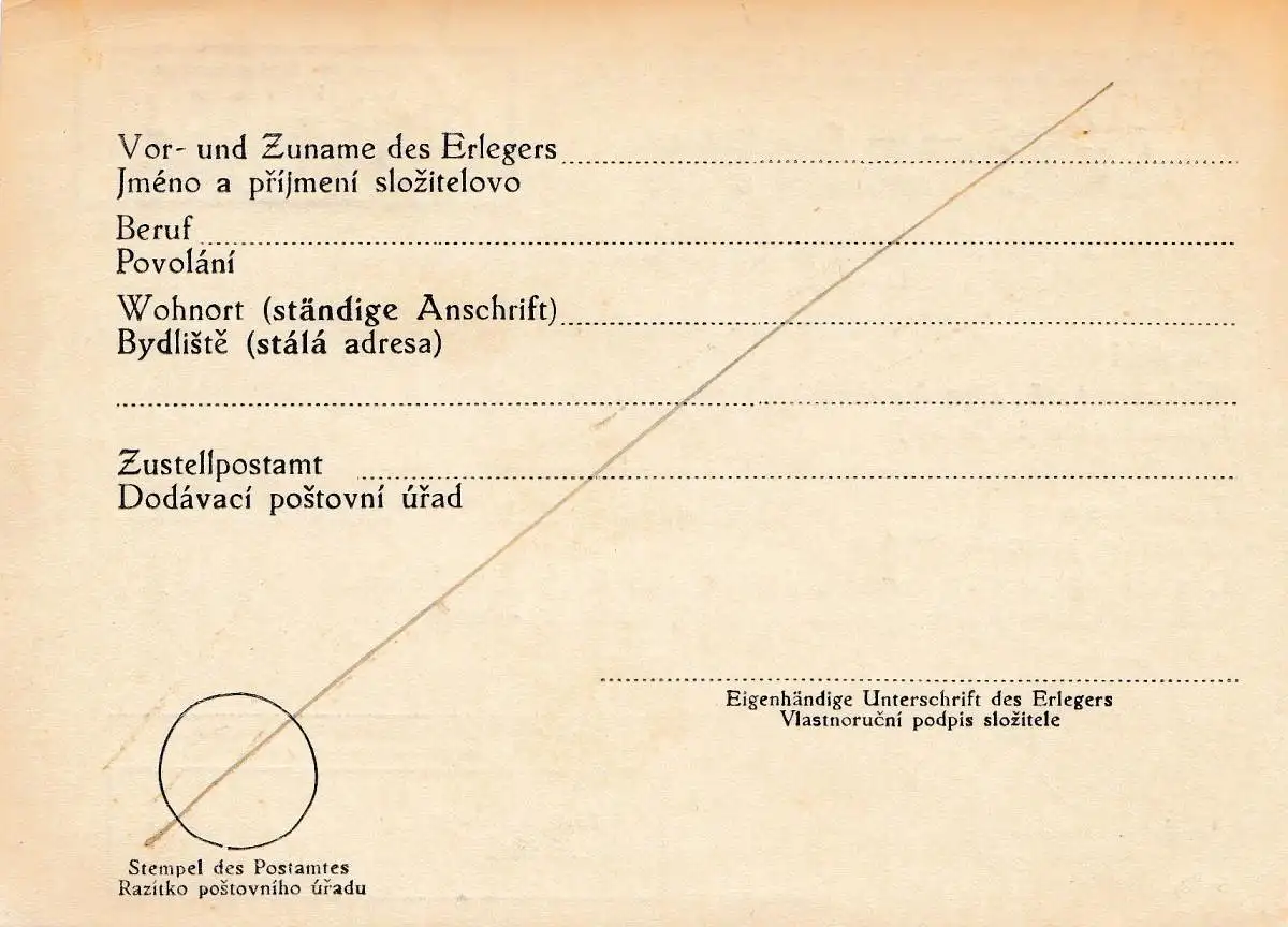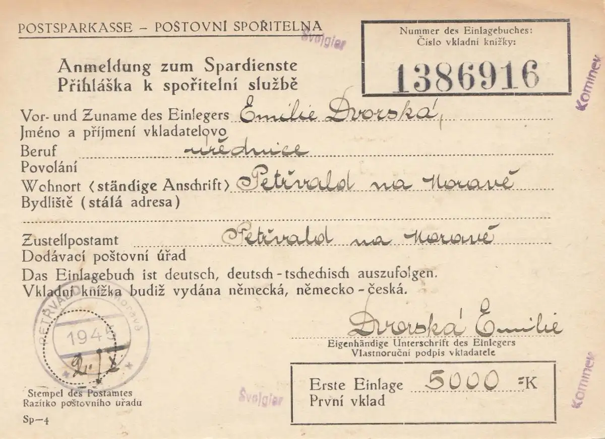 République tchèque: 1945: Caisse des chèques postaux, enregistrement Petrvald