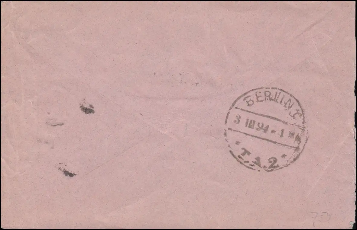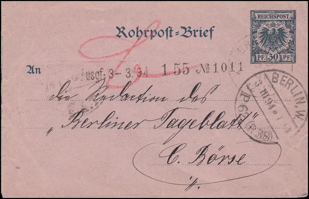 Enveloppe de tube postal RU 3 Adler 30 Pf BERLIN P62 (R38) 3.3.1894 à la Bourse de Berlin