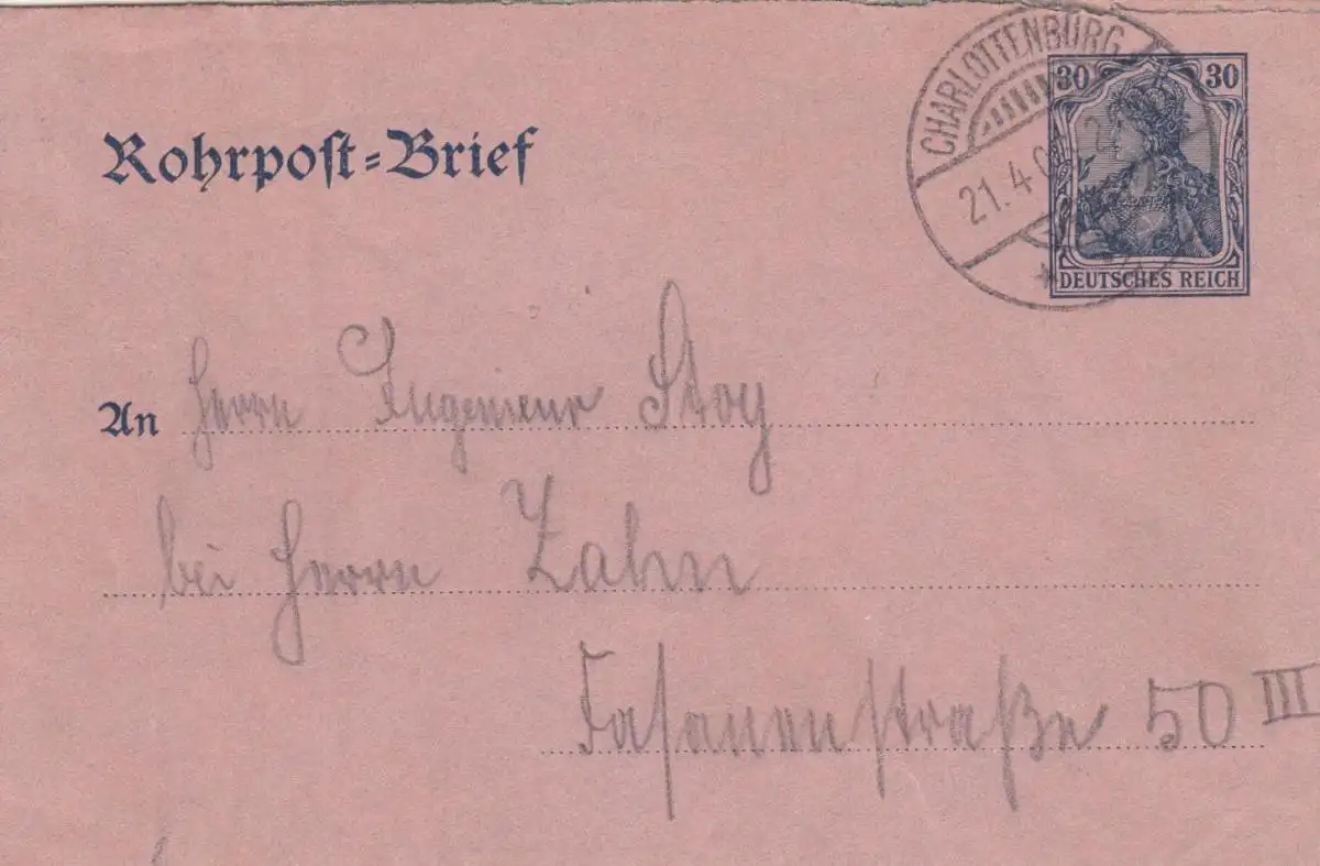 Lettre de Rohrpost 1905 à l'intérieur de Berlin