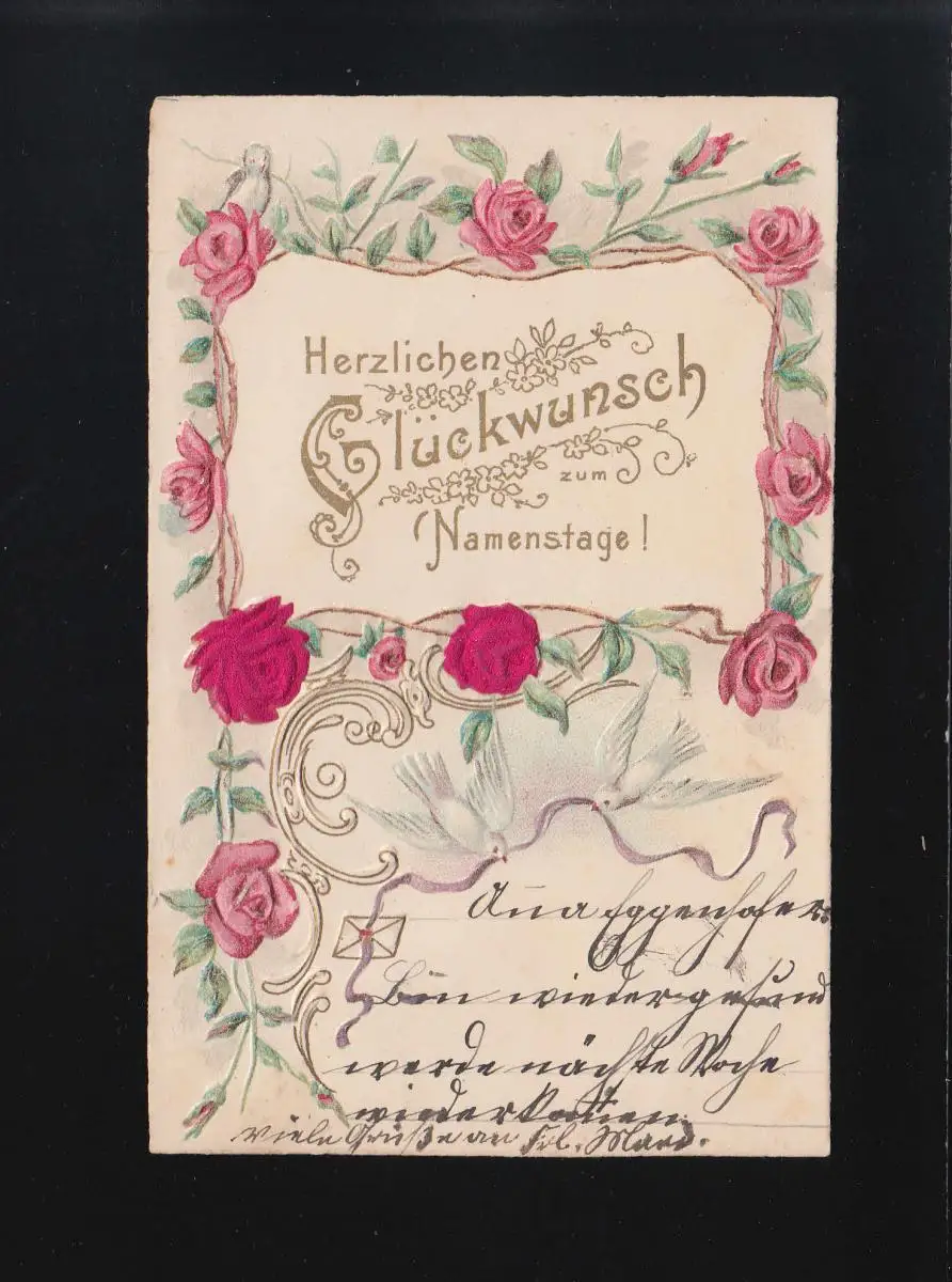 Roses pigeons avec ruban rose Félicitations à la lettre jour de nom, Weilheim 10.3.194