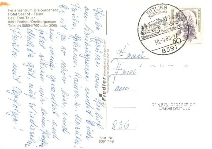 Rothau_Dreiburgensee Hotel Restaurant Seehof am Dreiburgensee Terrasse Gaststube Kapelle Maria Bruendl postalisch gelaufen 1988 Erhaltung siehe scans [WerneD78] WernPID7