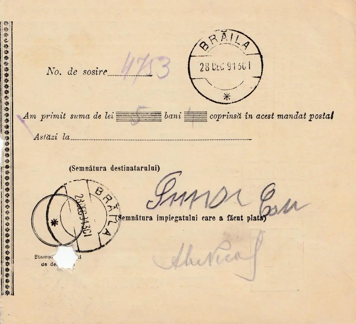 Roumanie: Mandat Postal Bucuresti à Braila
