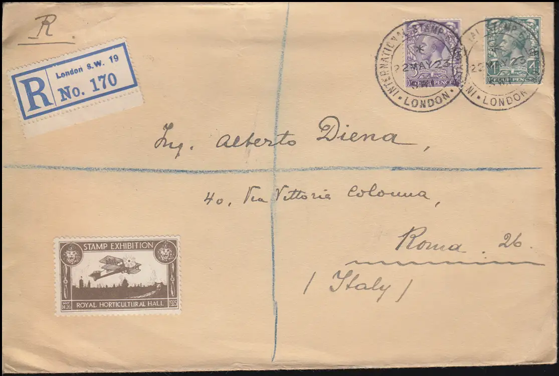 Lettre recommandée avec cachet spécial pour l'exposition internationale des timbres de Londres en mai 1923 et vignette d'expo adaptée en Italie, timbre d 'arrivée ROMA 25.5.23. N° de catalogue: 132+134 Examen: original Référence produit: 00000000020657>Note: Cet article n'est disponible qu'une seule fois. Vous recevrez exactement l \'article représenté.