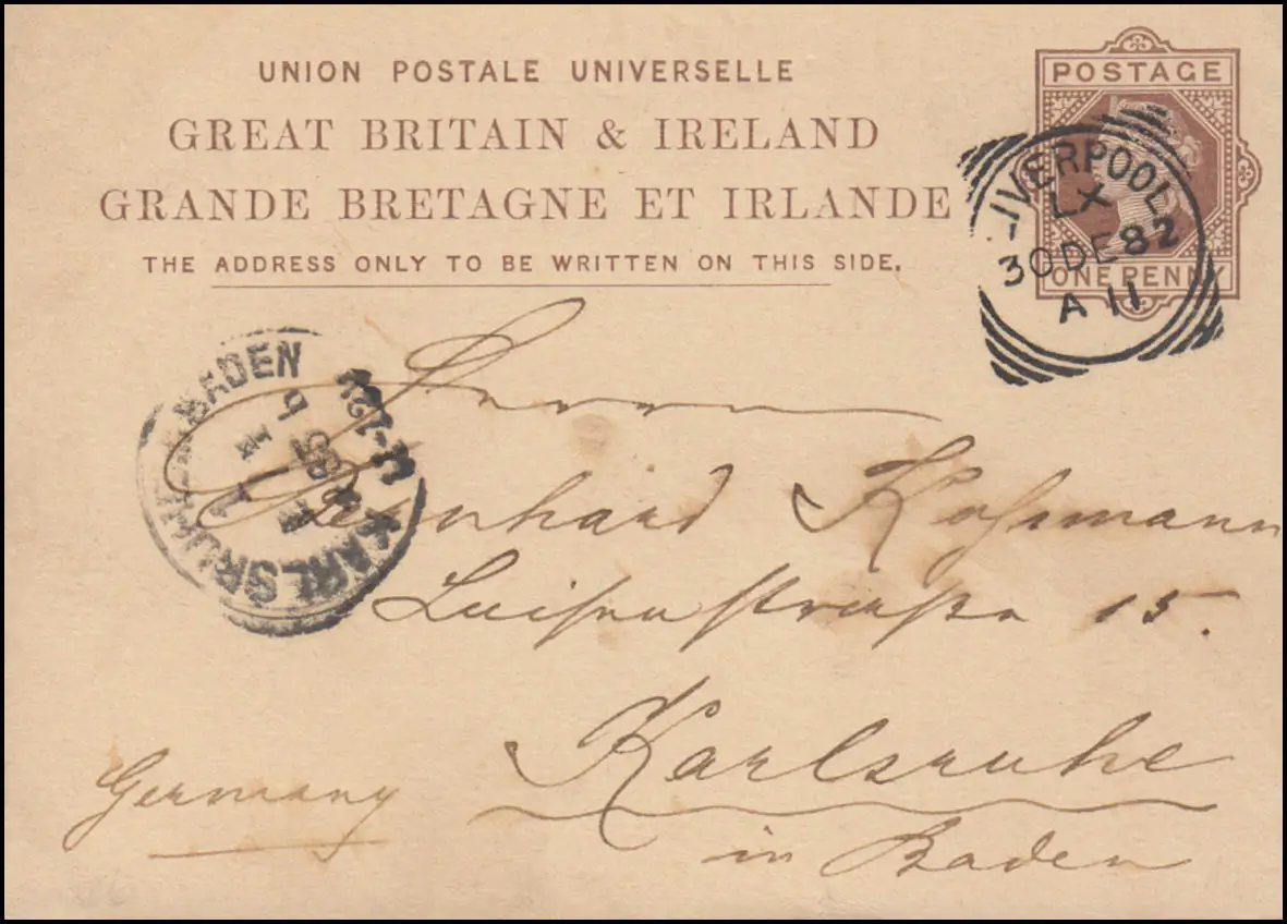 Royaume-Uni Carte postale P 16 Temple de rouille LIVERPOOL LX 30.12.1882 n. Karlsruhe