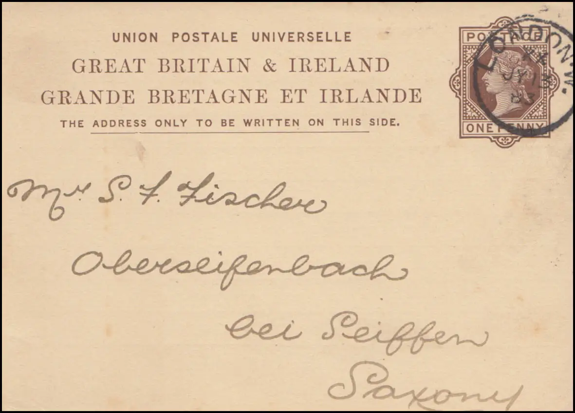 Royaume-Uni Carte postale P 16 de LONDON 13.7.1883 vers Oberseiffenbach / Saxe