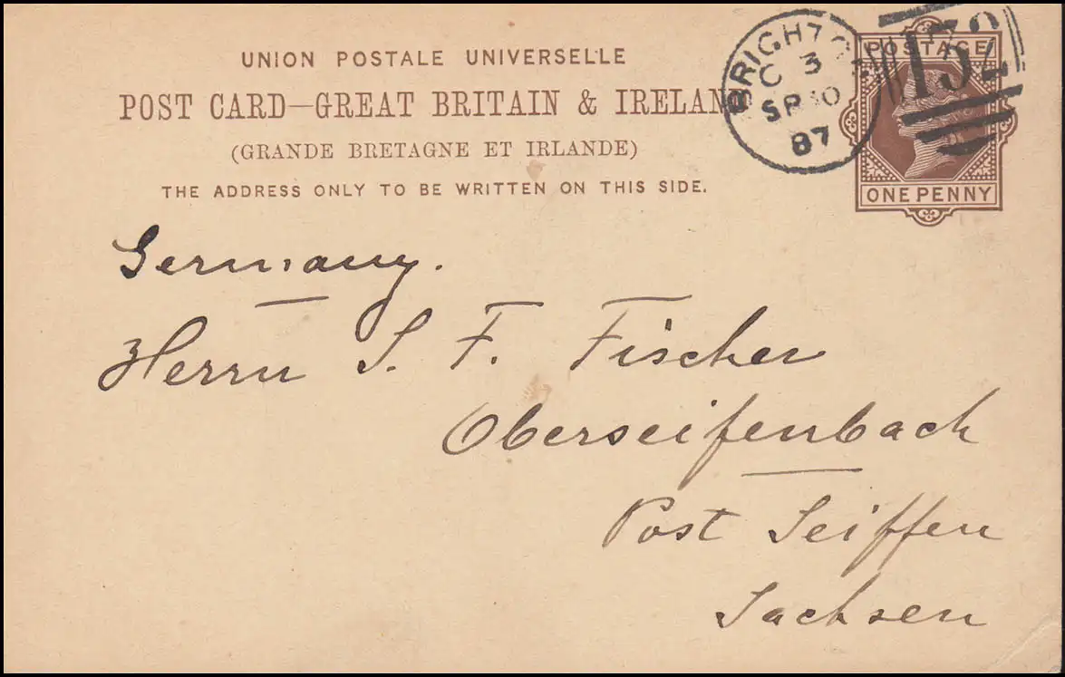 Royaume-Uni Carte postale P 18 DUP BRIGHTON C 3 - 132 - 30.9.1887 n. Allemagne