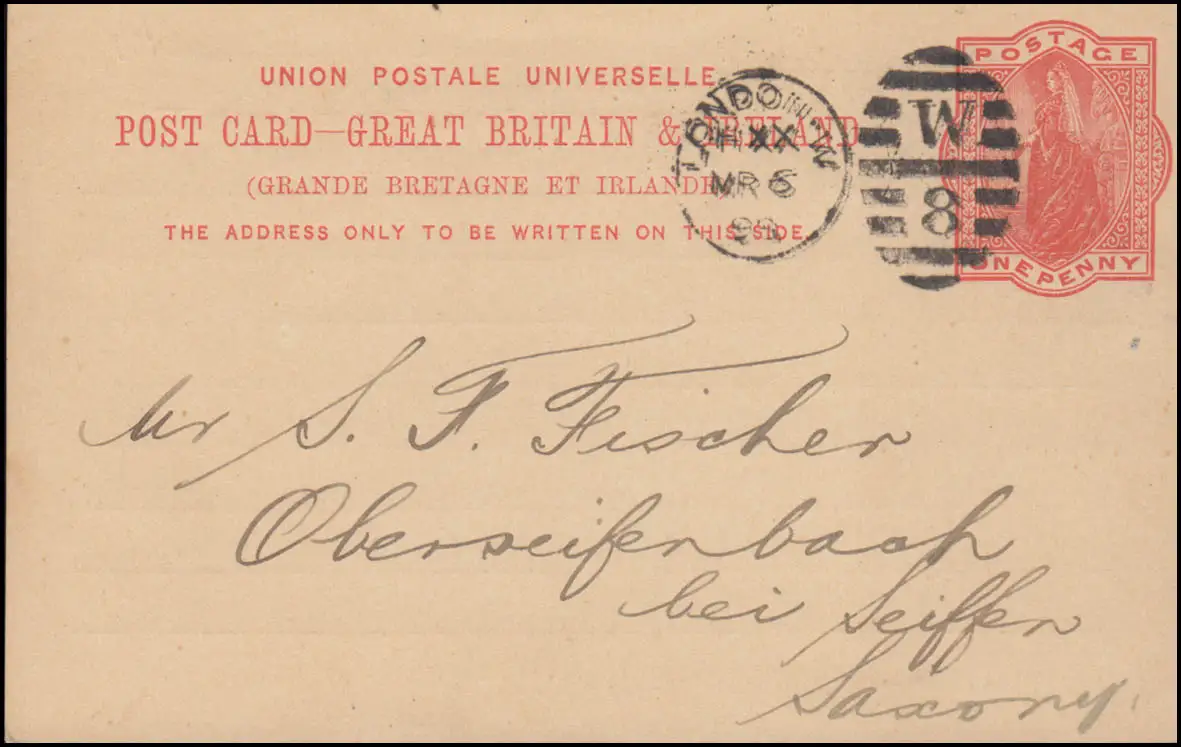 Royaume-Uni Carte postale P 26 DUP LONDON W 8 - 6.3.1893 vers Oberseiffenbach