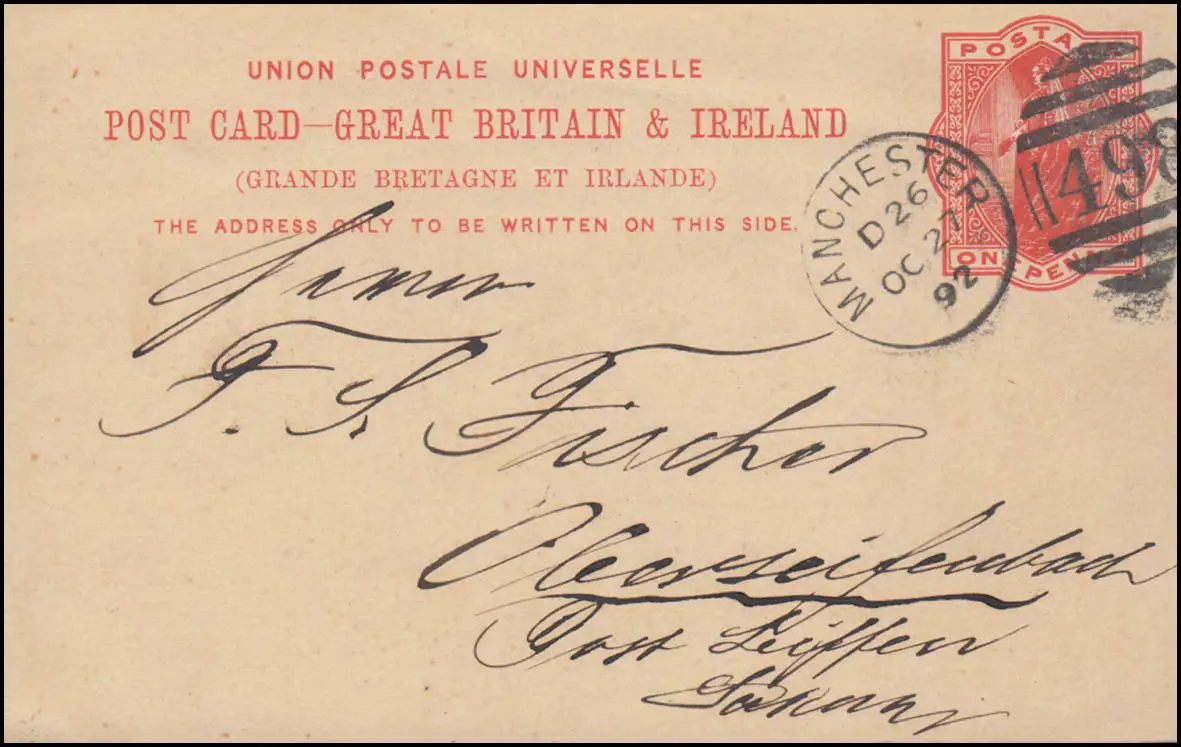 Royaume-Uni Pk P 26 DUP MANCHESTER 498 - 27.10.1892 vers Oberseiffenbach