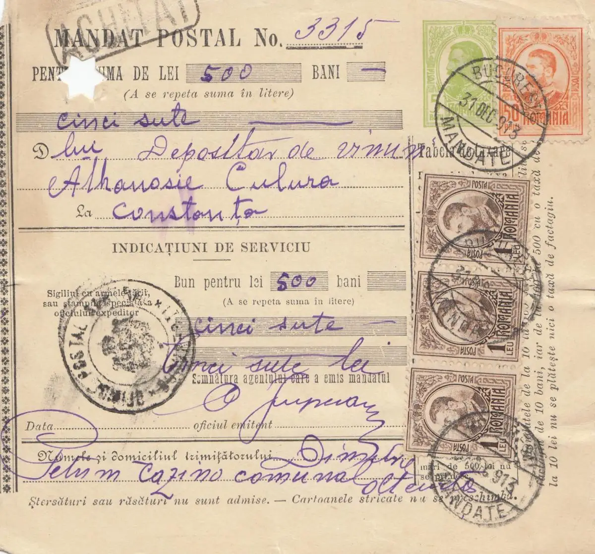 Roumanie: Mandat du Postal Bucaresti à Constanta en 1913