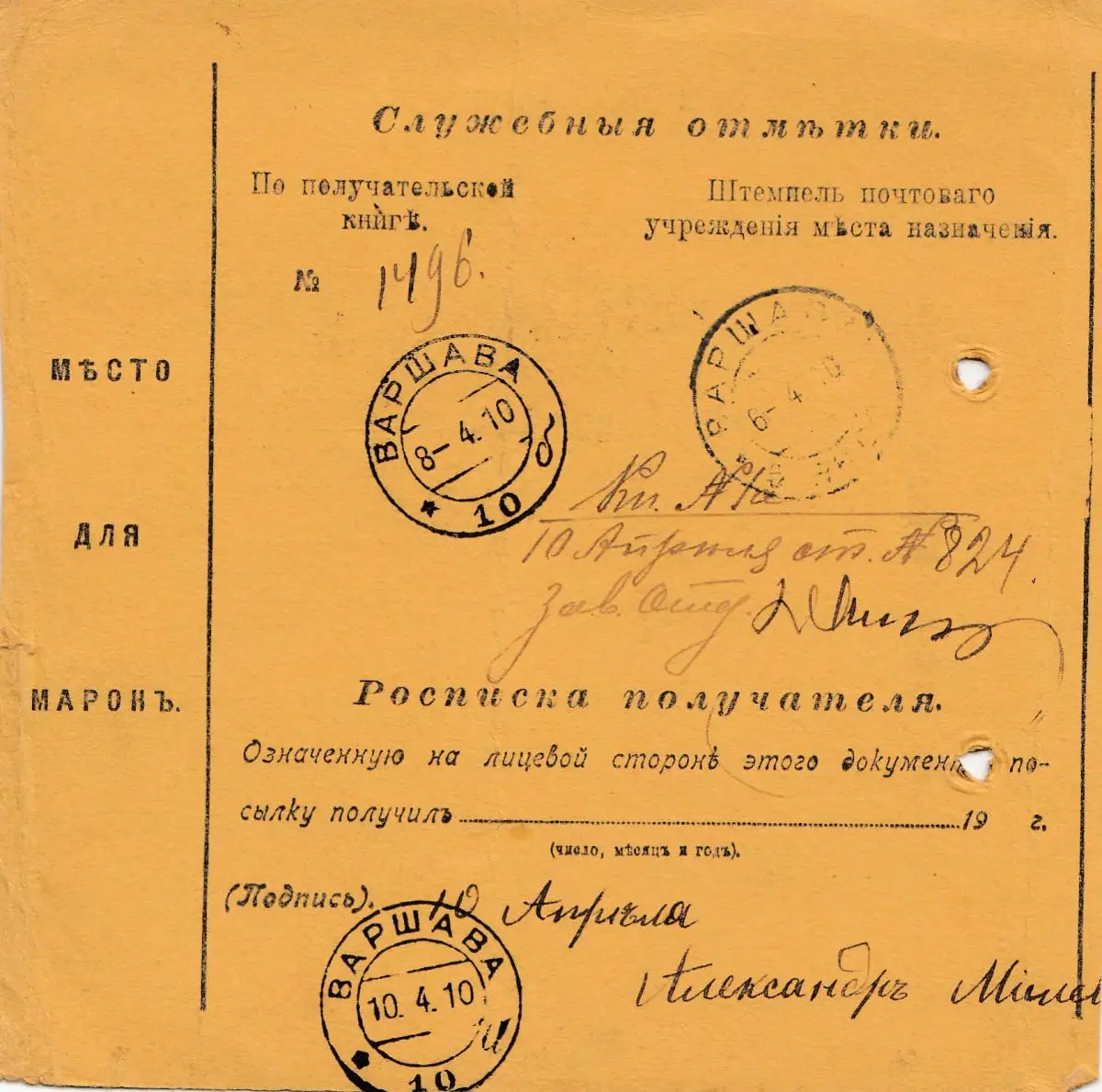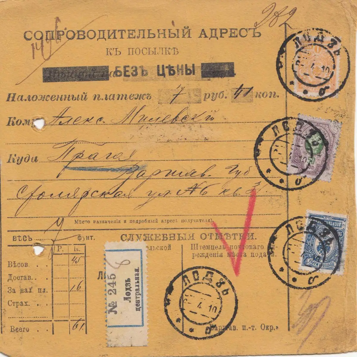 Russie: 1910: Carte de colis avec les notes de l'inscription du numéro dans le journal de bord
