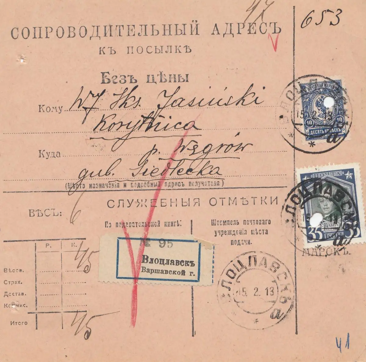 Russie: 1913. Carte de colis avec les notes de l'inscription du numéro dans le journal de bord