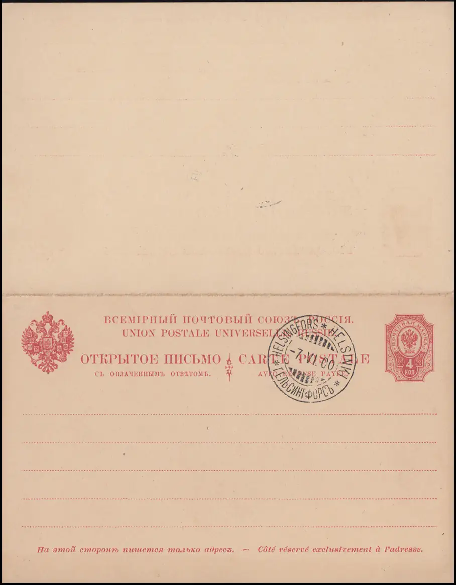 Russie / Finlande P 32 Carte double 4/4 Kop. karmin Gef.-O HELSINKI 7.6.1900