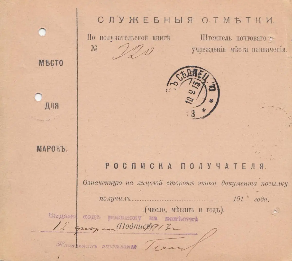 Russie:1913: Carte de colis avec les notes de l'inscription du numéro dans le journal de bord