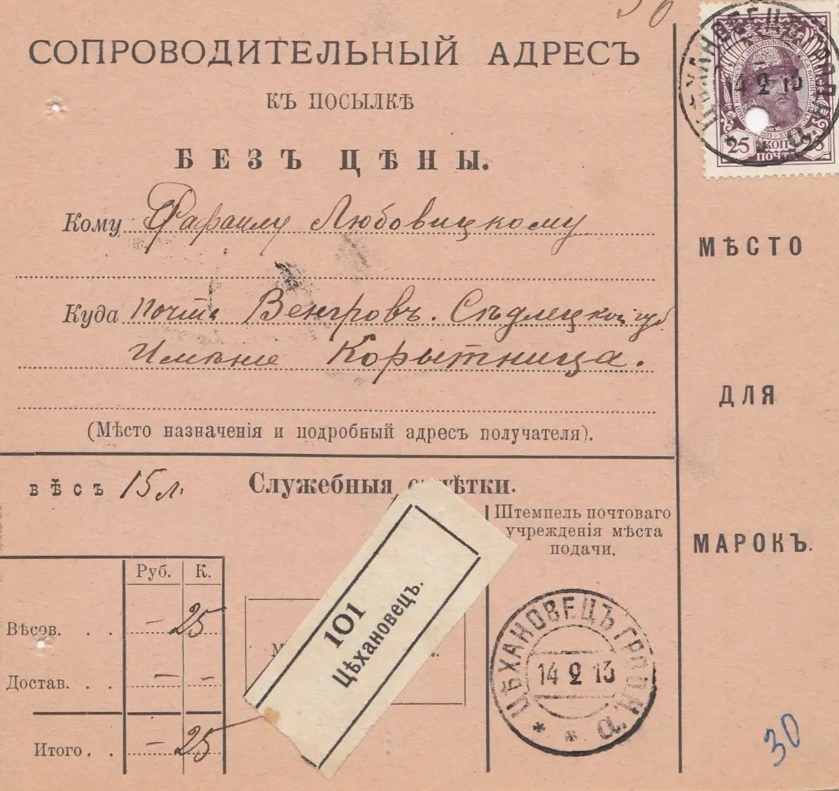 Russie: 1913: Carte de colis avec les notes de l'inscription du numéro dans le journal de bord