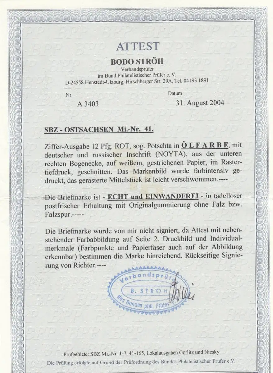 SBZ: Min. 41, bord de l'angle, frais, BPP Attest