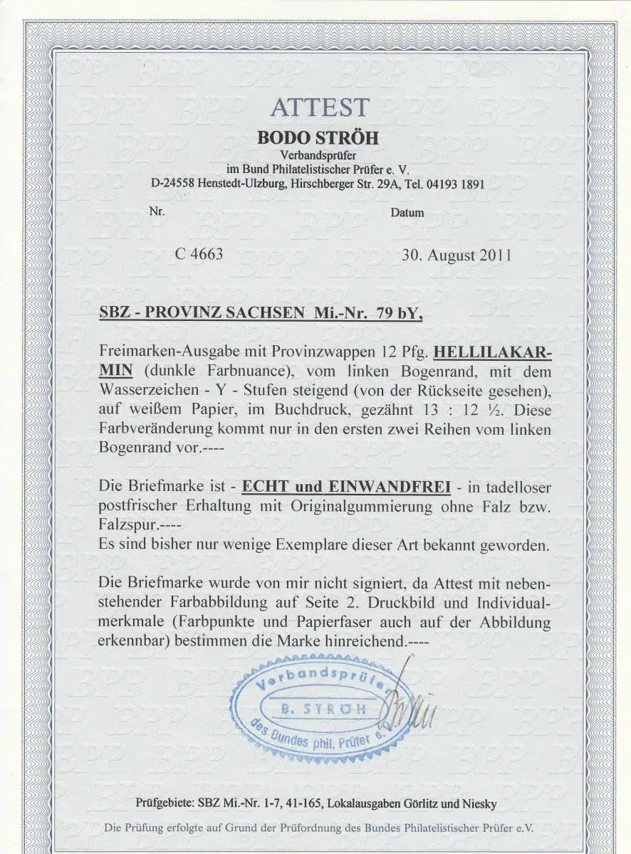 SBZ: N° 79 bY, papier blanc, **, frais, BPP Attest