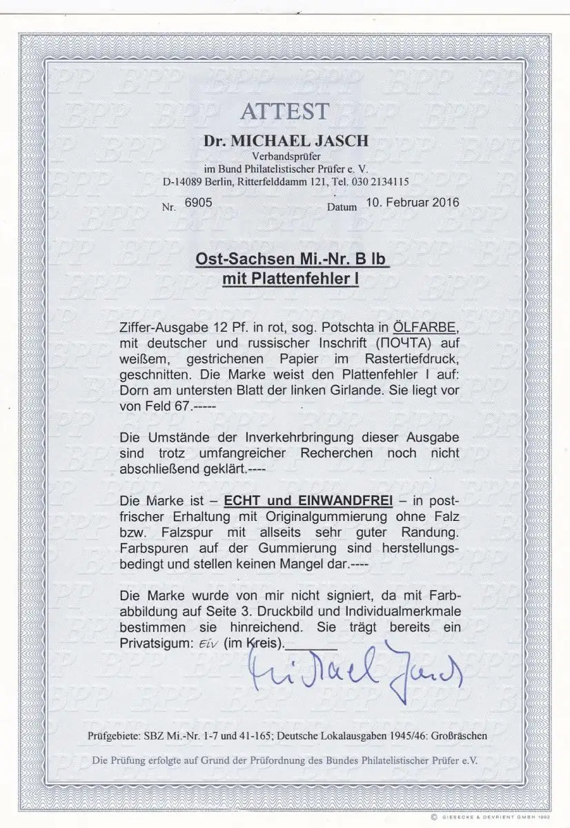SBZ: Est Saxe: MiNr. B Ib, erreur de plaque I, BPP Attest