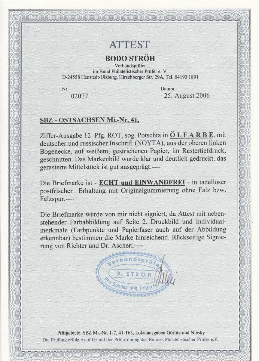 SBZ: Saxe oriental: MiNr. 41, frais post-classique, BPP Attest, Eckrand
