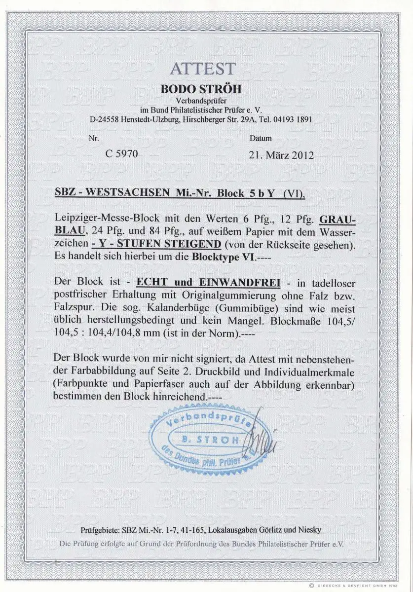 SBZ Saxe-Ouest: Min. Blcok 5 b Y (VI), frais de port, BPP Attest
