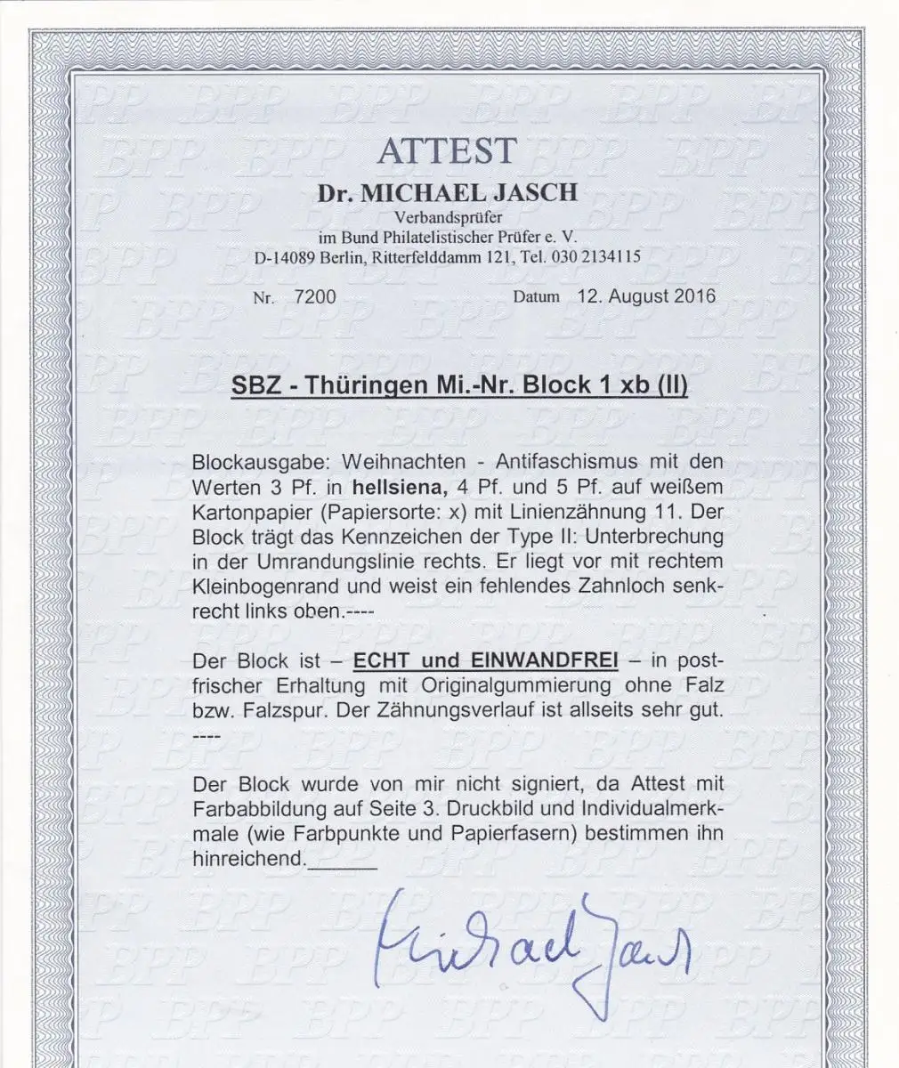 SBZ: Thuringe Min. Block 1 Xb (II), frais de port **, BPP Attest