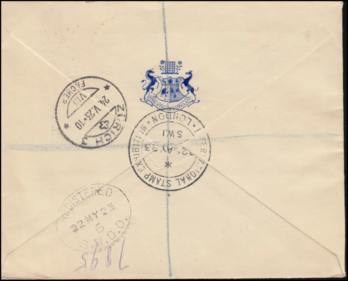 Lettre postale aérienne Londres - Paris - Lausanne - Zurich, Enregistré LONDON S.W: 19, Tampon spécial INTERNATIONAL EXHIBTION LONDON, Tempête d'arrivée ZÜRICH 3 PAGE 24.5.23 Vérification: original Référence produit: 00000000033592