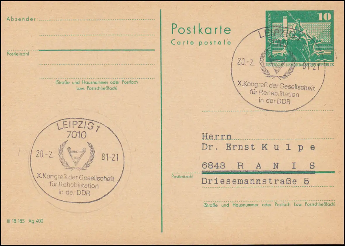 Timbre spécial X. Congrès de la Société de Rééducation en RDA LEIPZIG 20.2.81 sur carte postale par Ranis / Photo: Symbole de réhabilitation Numéro de catalogue: P79 Examen: original Référence produit: 00000000044749>Remarque: Cet article n'est disponible qu'une seule fois. Vous recevrez exactement l'article représenté.