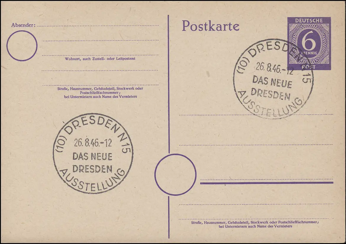 SSt DRESDEN Exposition Le Nouveau Dresde 26.8.1946 sur carte postale blanche P 951