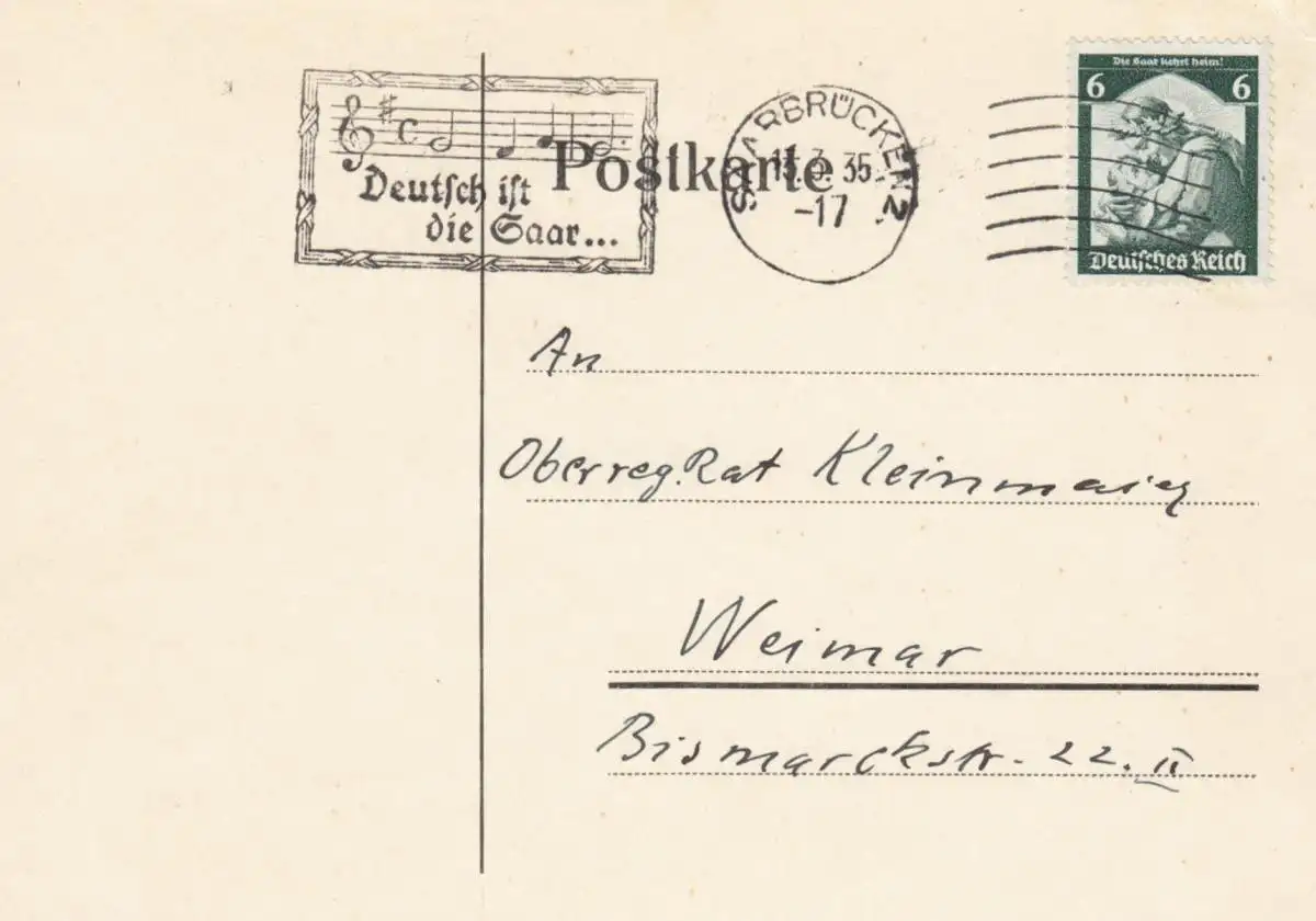 Sarrebruck 1935: Tampon publicitaire: La Sarre sur carte postale à Weimar