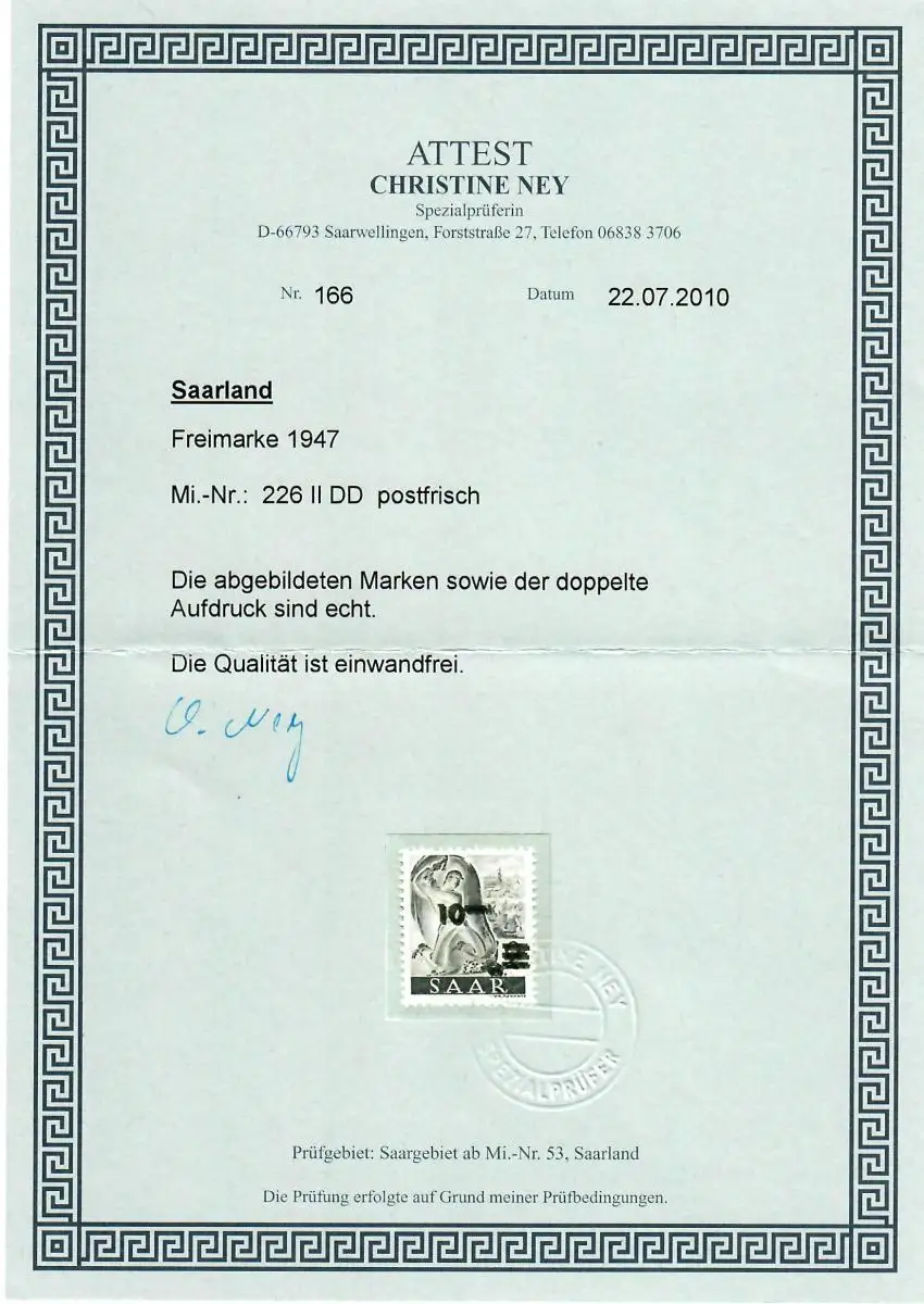 Sarre 1947: MiNr. 226 II DD, post-fraîchissement, **, BPP Signature