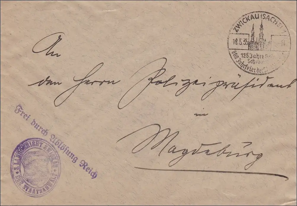 Cour administrative de Saxe Zwickau 1935 avec cachet spécial après Magdeburg