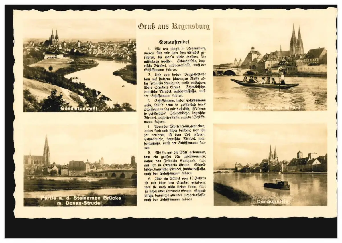 Salutation AK de Ratisbonne avec poème Danaustrudel et 4 images, inutilisé