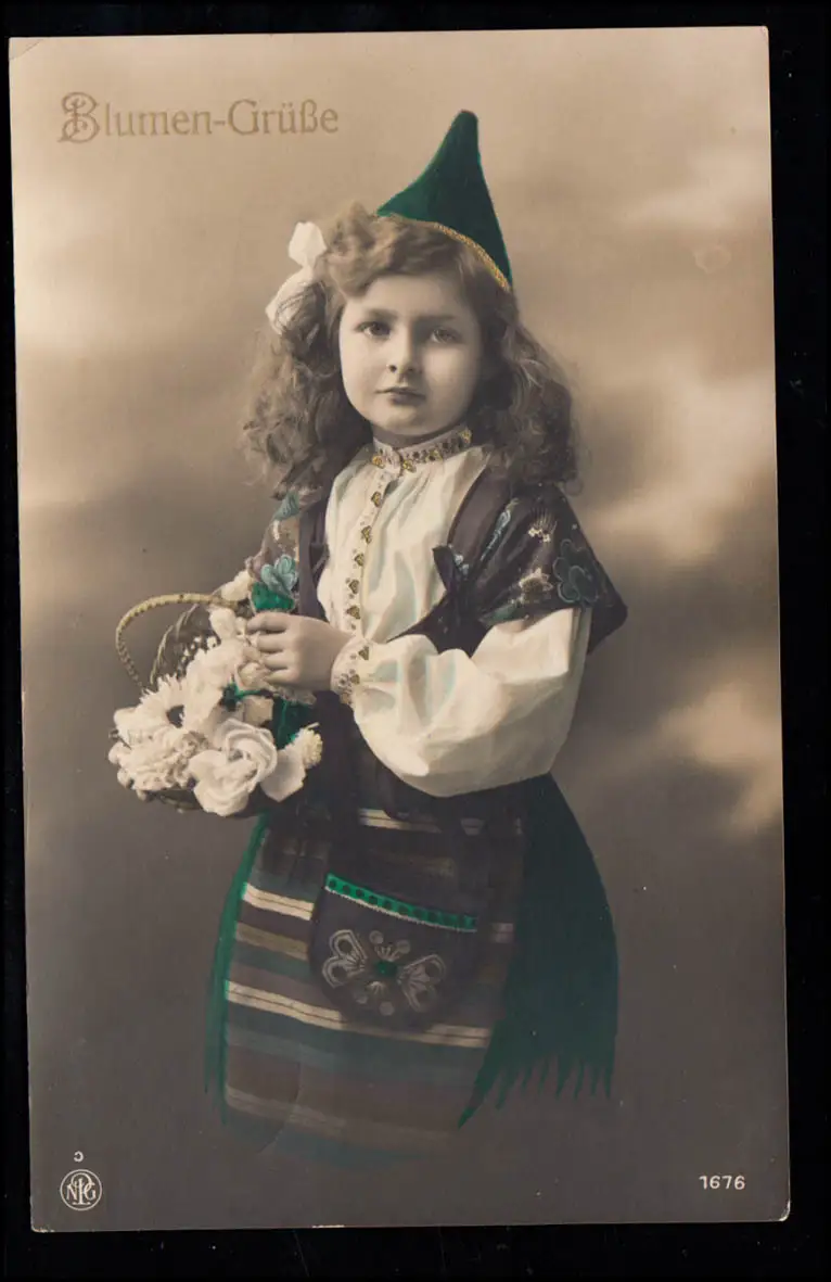 Salutations de fleurs pour enfants AK: Fille à costumes avec bonnet Fleurs HAAG am HAUSRUCK 1911