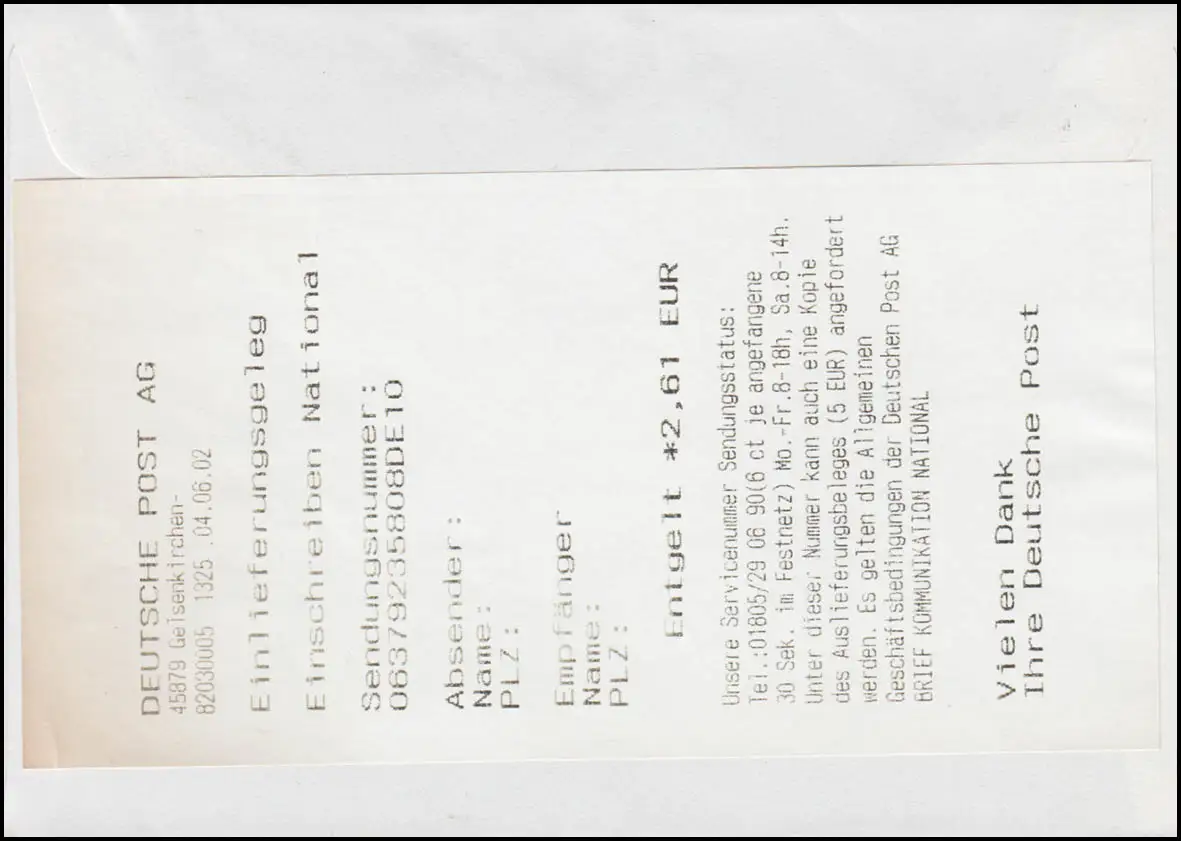 Gelsenkirchen 4.6.2002: Envoi d'une lettre recommandée avec reçu d ' un autocollant R spécial avec montant de port imprimé, lieu et date. - Au cours de la phase d\'essai de Samkyung, ce auto auto-colle R a été collé et le port est collé en plus (SWK 2225 Heidelberger Schloss 2,61 Euro / Tampon quotidien GELSENKICHEN 5.6. 2002). - En cas dÂ'erreur de programme: ...au lieu de ... preuve! Vérification: original Numéro d ’ article: 00000000029823>p>Remarque: Cet article n'est disponible qu' une seule fois. Vous recevrez l'article exactement représenté.