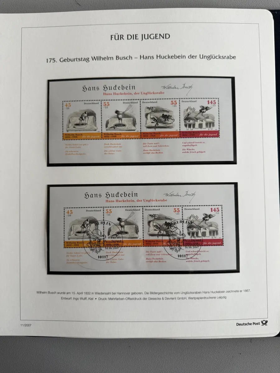 Vordrucksammlung der Deutschen Post AG in zwei reich illustrierten repräsentativen blauen Ringbindern mit Schuber (passende Goldprägung) mit je einer Bogenecke aller Ausgaben aus 10er-Bogen von 2003 bis 2009 postfrisch ** UND mit zentrischem Ersttagssonderstempel ESST incl. der Blockausgaben. Die Sammlung enthält natürlich auch die entsprechenden Beschriftungsblätter - so wie im Post-Abo geliefert. Enorm hoher Einstandspreis! Der Angebotspreis dürfte noch unterhalb des Postpreises der noch frankaturgültigen postfrischen Marken liegen. Die gestempelten Marken, die Vordrucke, die Beschreibungstexte sowie die Alben gibt es somit als Zugabe obendrein. Sauber aus Sammler-Nachlass. Versand als DHL-Paket.