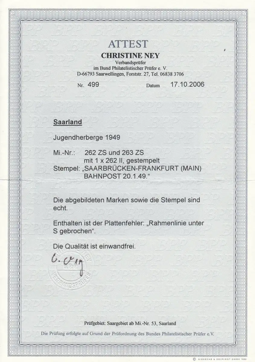 Sarre Min. 262 ZS et 263 Z S avec 262 II, cacheté en 1949, BPP Attest