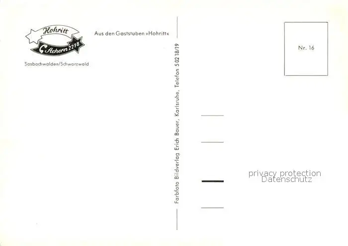 Sasbachwalden Aus den Gaststuben Hohritt Sasbachwalden postalisch nicht gelaufen nach 1965 Erhaltung siehe scans [WerneD78] WernPID7