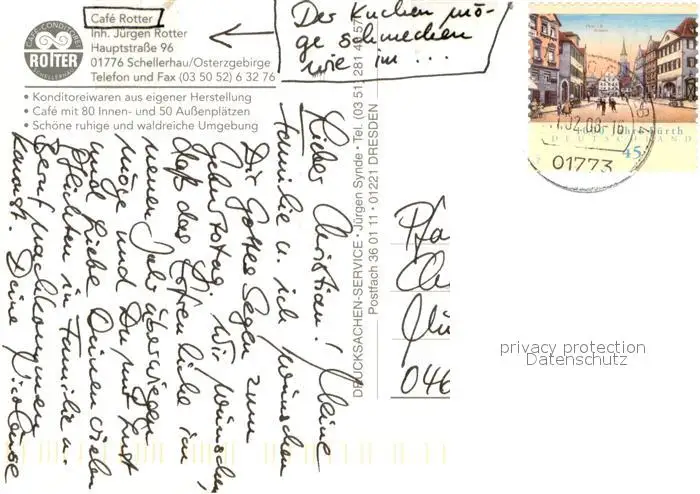 Schellerhau Cafe Rotter Kuchentheke Terrasse Gaststube Schellerhau postalisch gelaufen 2008 Erhaltung siehe scans [WerneD78] WernPID7