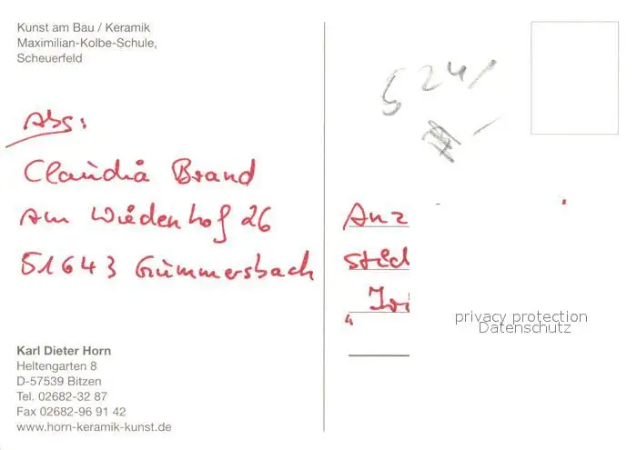 Scheuerfeld_Sieg Kunst am Bau Keramik Maximilian Kolbe Schule Scheuerfeld Sieg postalisch nicht gelaufen nach 1965 Erhaltung siehe scans [FriedD77] Frierer