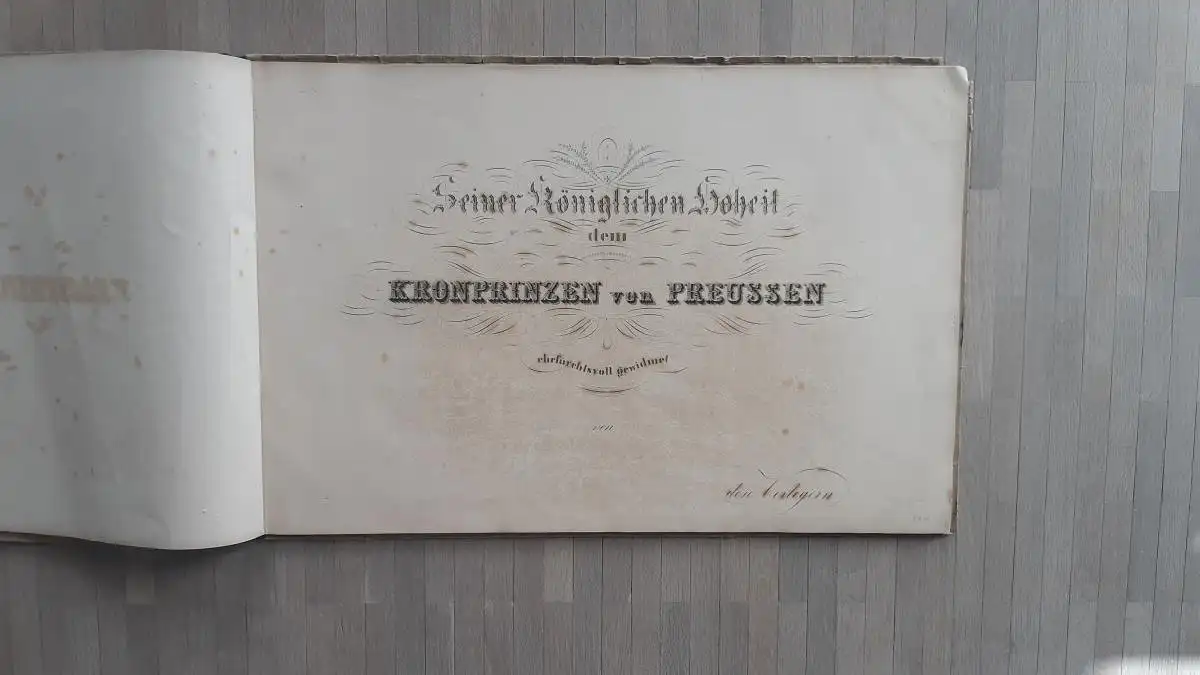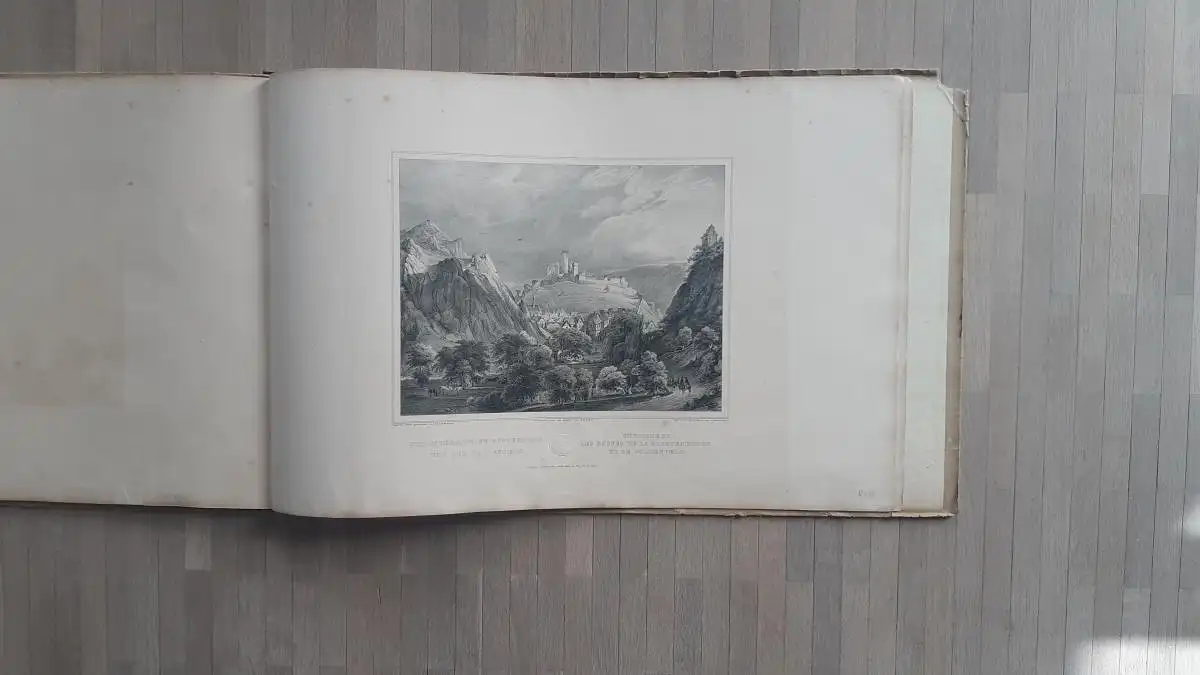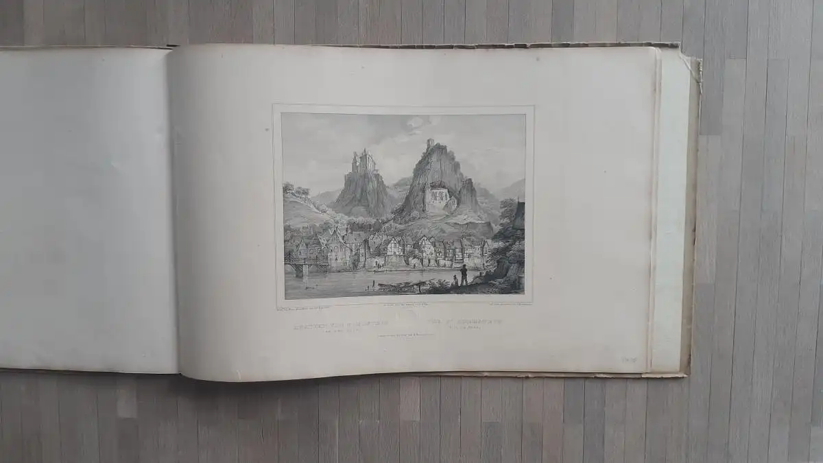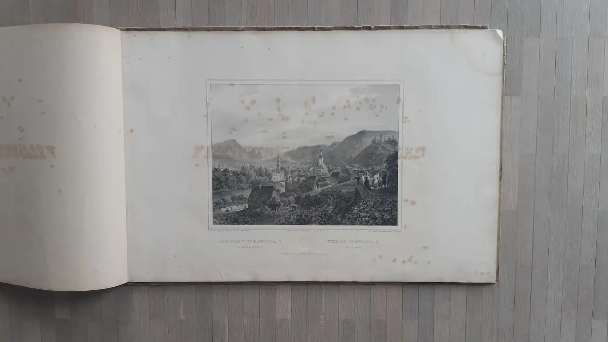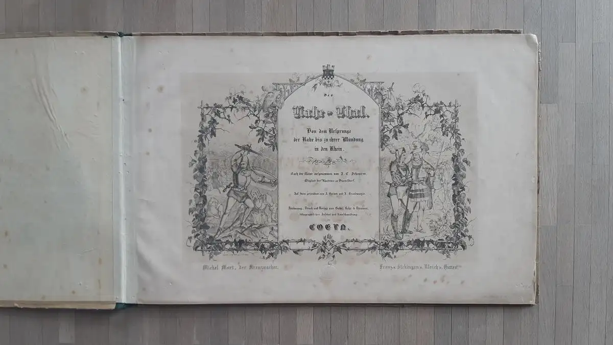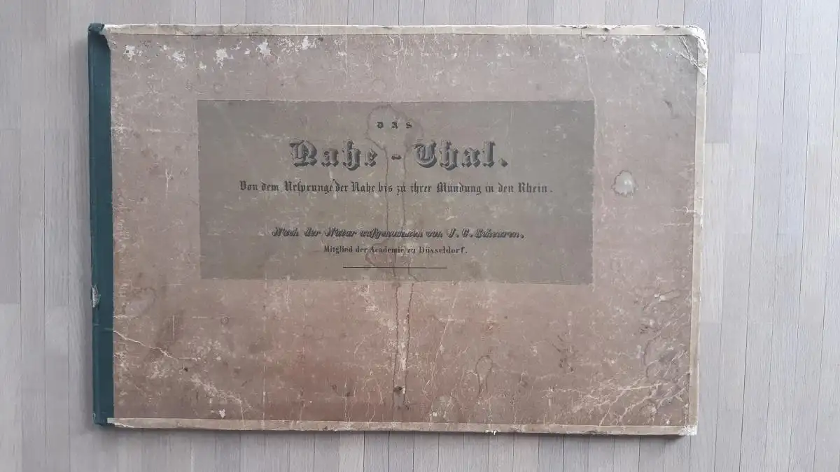 Titel: Das Nahe-Thal. Von dem Ursprunge der Nahe bis zu ihrer Mündung in den Rhein. Nach der Natur aufgenommen von J.C. Scheuren. Auf Stein gezeichnet von A. Borum und A. Brandmayer. Mit lithogr. Titel von D. Levy, lithogr. Widmungsblatt und 20 lithogr. Ansichten. Köln, Gebr. Kehr & Niessen, (1837).